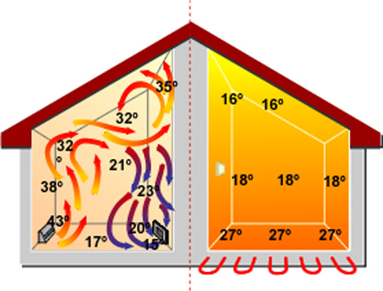 También guarda ventaja frente a los aires acondicionados; estos lanzan el aire desde arriba hasta abajo por lo tanto, la zona necesaria de percibir más calor (zona baja) se encuentra más alejada de la fuente emisora. Este conlleva a un consumo mayor de aire acondicionado/calefacción para conseguir una temperatura agradable en comparación con el suelo radiante, desde que el calor procede del suelo, siendo las capas altas más cercanas al techo las últimas en aclimatarse.